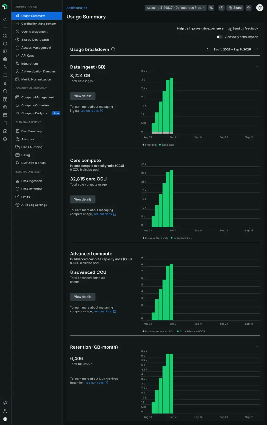 From the default UI, you can view metrics such as total data ingested, core compute usage, advanced compute usage, and data retention for the current month, updated daily. Depending on your organization's requirements, you can choose to see consumption on a daily basis or review historical data from previous months.