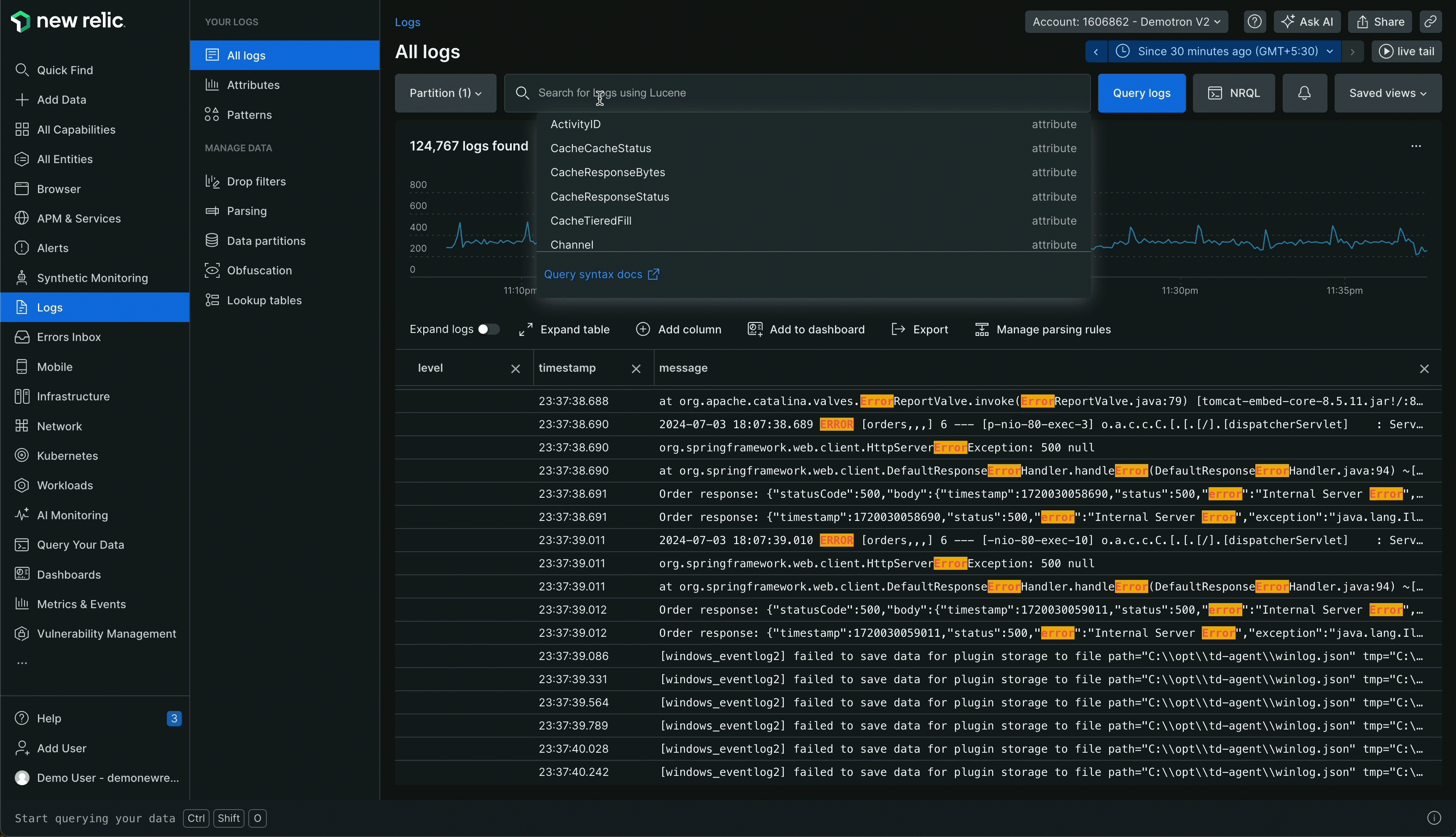 You can chat with New Relic AI about log errors directly from any logs panel in the UI. If you're just starting out, however, you can follow this path: