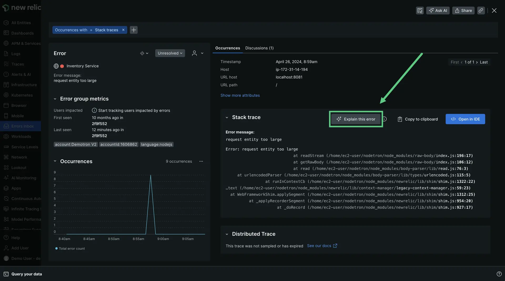 - Look for the Explain this error button embedded in the Stack trace panel. New Relic AI will provide a summary of the error.