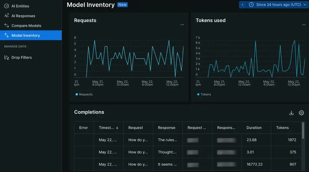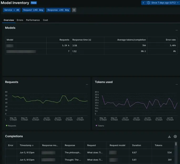 • Model inventory: A centralized view that shows performance and completion data about all AI models in your account. Isolate token usage, keep track of overall performance, or dig into the individual completions your models make.