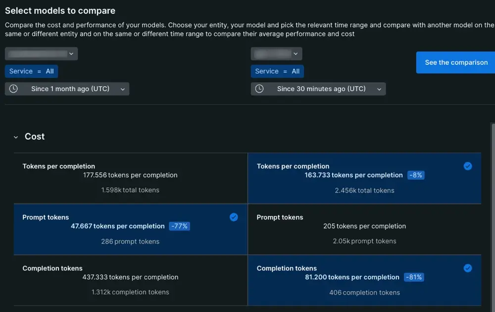 • Compare two models in the same service: Service X uses model A during week one, but then uses model B on week two. You can compare performance by choosing service X, selecting model A, and setting the dates for week one. On the second side, choose service X, select model B, and set the dates for week two.