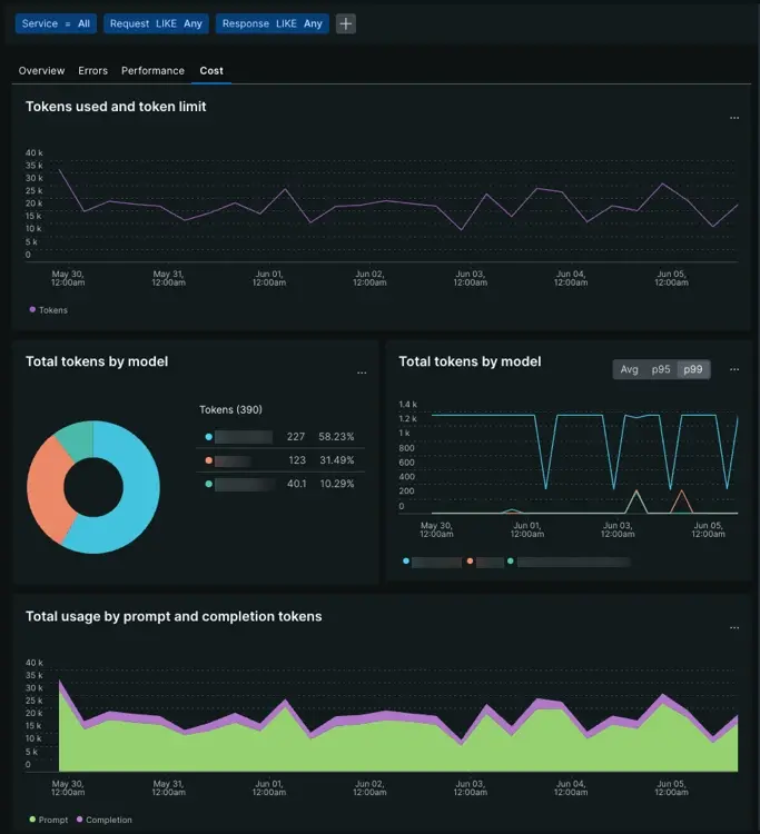 The cost tab uses a combination of time series graphs and pie charts to identify cost drivers amongst your models. Determine the number of tokens came from either prompts or completions, or if certain models cost more on average than others.