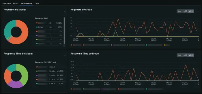 From the overview tab, explore the number of requests made to a model against its response times, or analyze time series graphs to see when model behavior changed. From there, investigate the errors, performance, or cost tabs.
