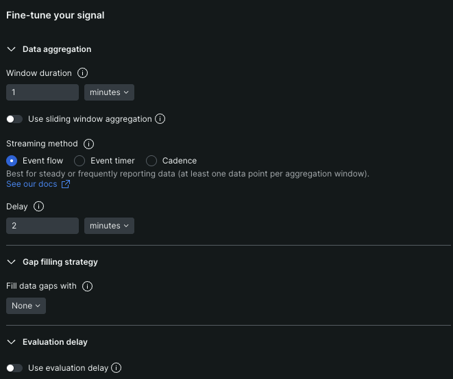 Set how long to wait for events that belong in each evaluation window. A longer delay time may increase alert accuracy but delay notifications. | |
