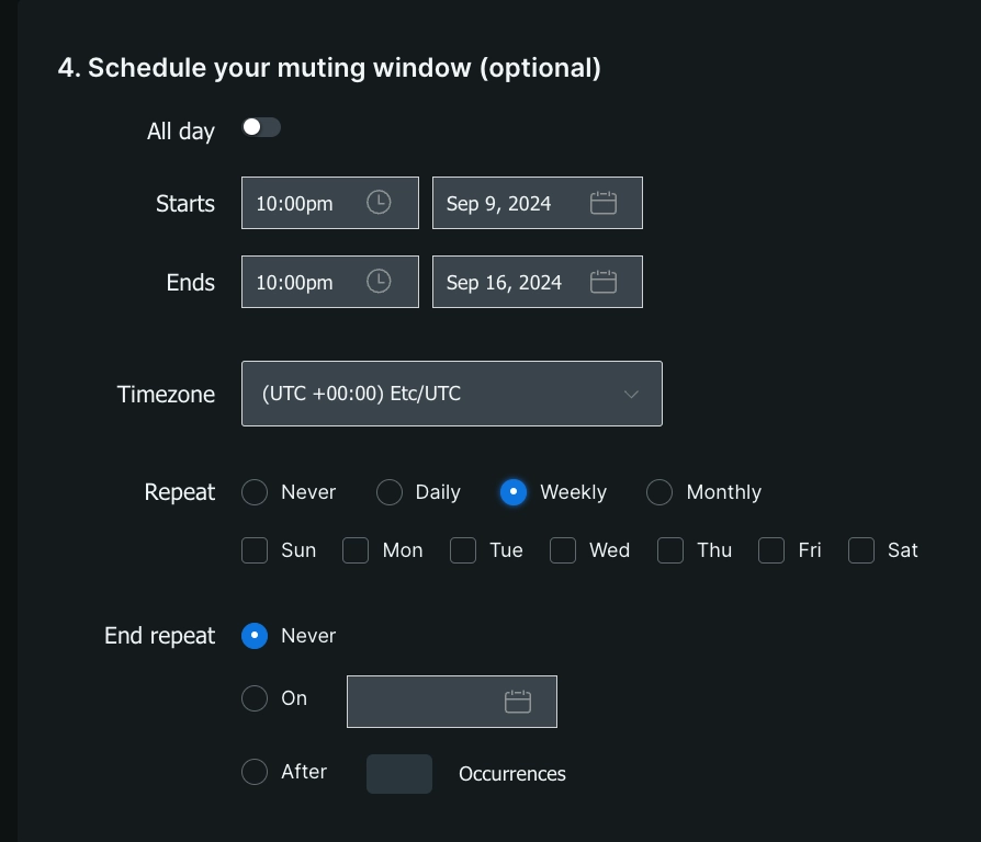 You can schedule your muting rules to recur daily, weekly, or monthly. A muting rule that's scheduled to repeat weekly includes the option to select the days of the week to recur. If no days are selected, the weekly recurrence will default to repeating on the day of the week that the muting rule is scheduled to start.
