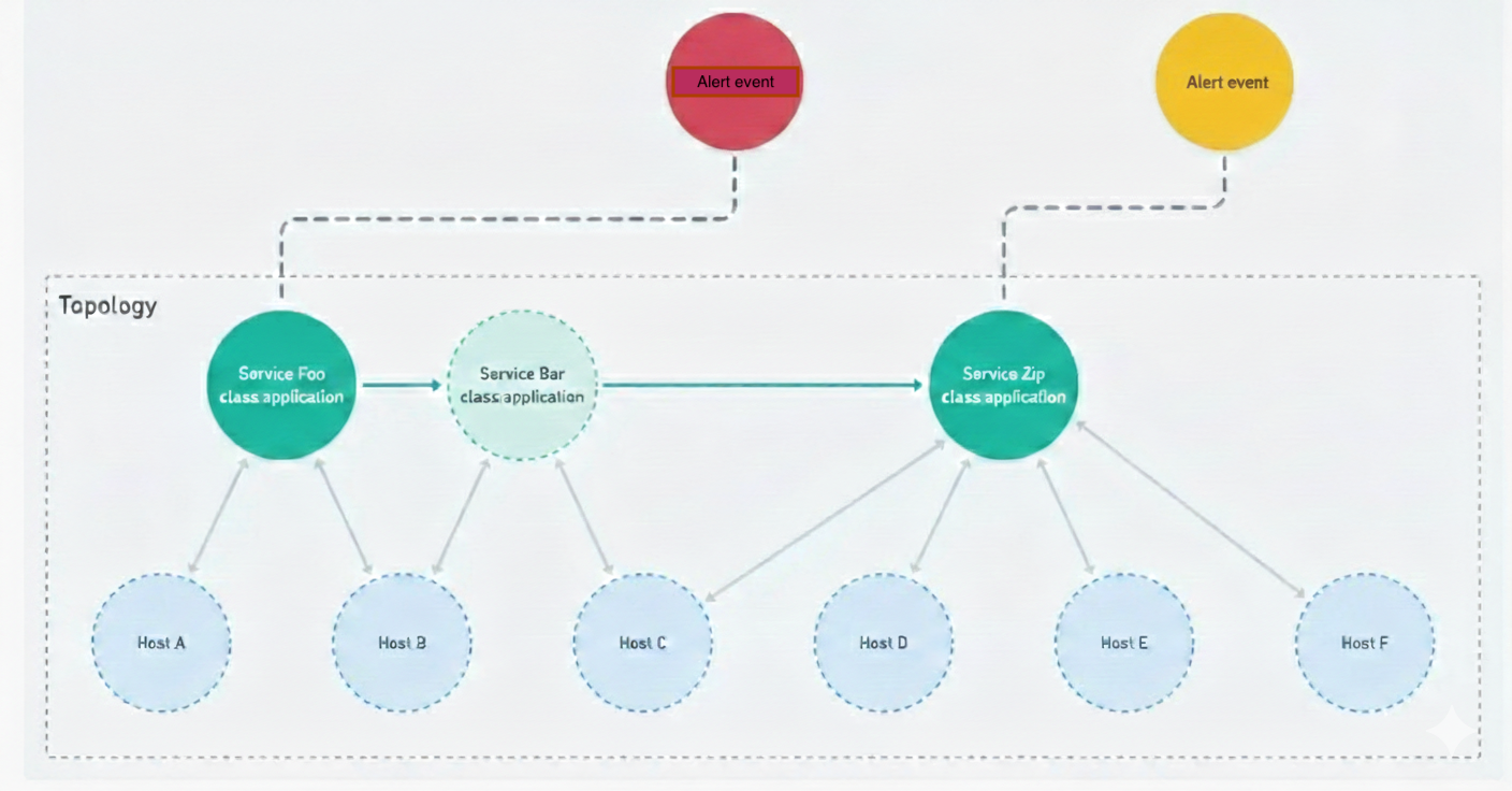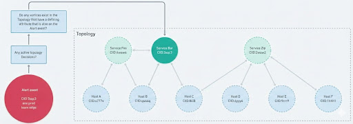 Next, we attempt to associate each alert event to a vertex in your topology graph, using a vertex's defining attributes and the available attributes on the alert event.