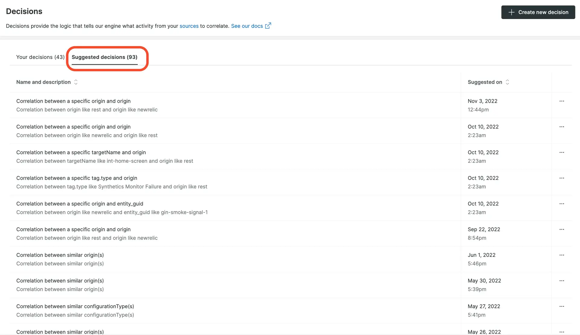 - Suggested decision: New Relic's correlation engine constantly evaluates your event data to suggest decisions that capture correlation patterns to reduce noise. You can preview simulation results of a suggested decision and choose to activate.