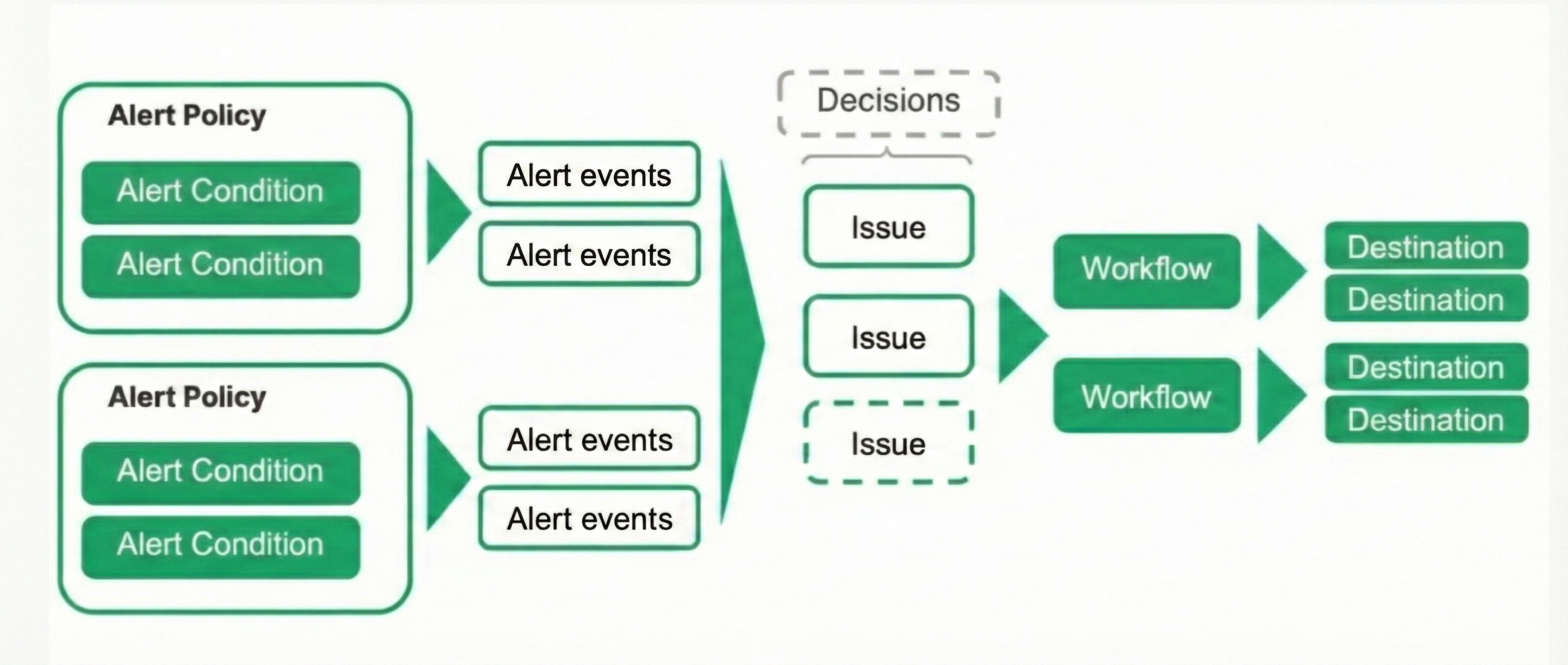 This diagram shows how alerts work: you create an alert policy that includes an alert condition or several alert conditions. Alert conditions include a defined threshold and when that threshold is breached, an alert event triggers. If you've configured a workflow, then you'll receive a notification. You can group alert events into issues and issues into decisions to have better management of your alerts.
