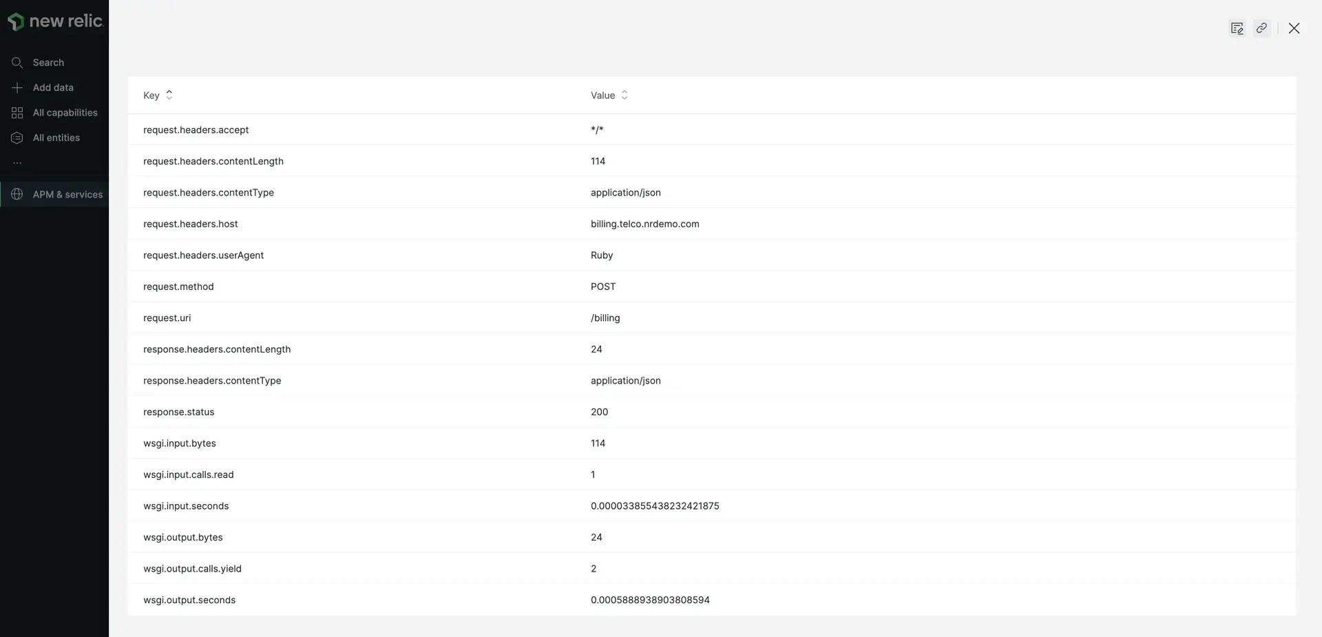 one.newrelic.com > All capabilities > APM & services > (select an app) > Monitoring > Transactions > (select a transaction) > (select a trace): Here is an example from the Ruby agent of the Request attributes and Custom attributes for a transaction trace. Exact attributes depend on your agent and on your attribute configuration.