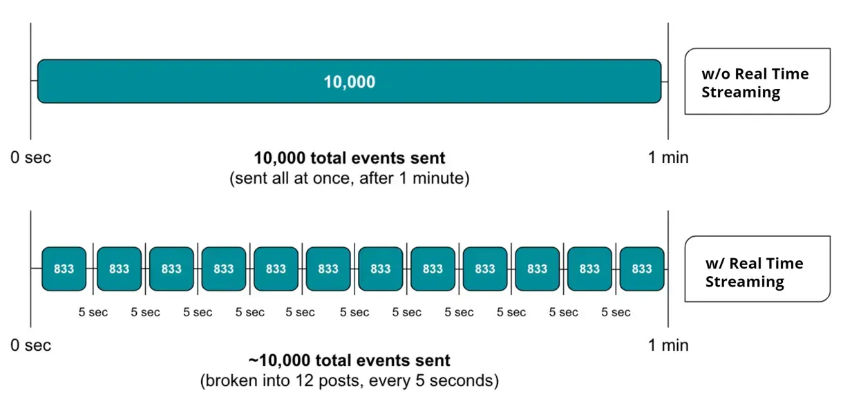 The following image shows a comparison between data sent to New Relic with and without real time streaming. Note that 10,000 is an example number of events; some agents have lower default limits.