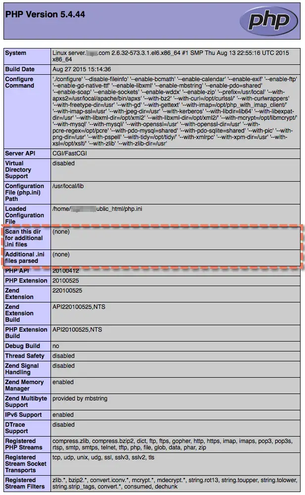 Sample phpinfo() showing top of page: Verify that the configuration file is being read by checking the top section for the Configuration File Path, the Loaded Configuration Files and the Addition .ini files parsed locations if data does not appear on your APM Summary page within a few minutes after configuration and restarting your webserver and PHP.
