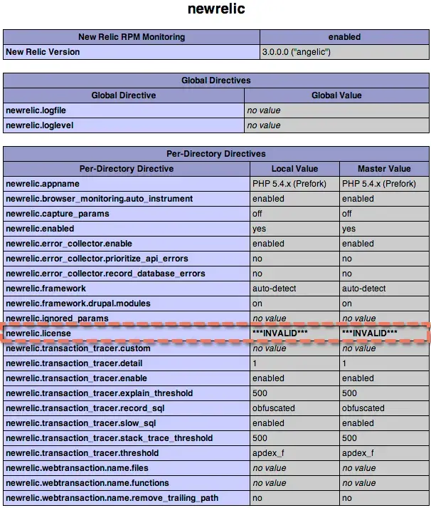 5. If newrelic does appear in your modules list, verify that the license.key entry shows the first and last few characters of your