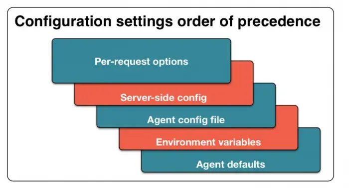 With the Python agent, per-request options override server-side config. If enabled, server-side config overrides all corresponding values in the agent config file, even if the server-side values are left blank. The agent config file overrides environment variables. Environment variables override the agent defaults.