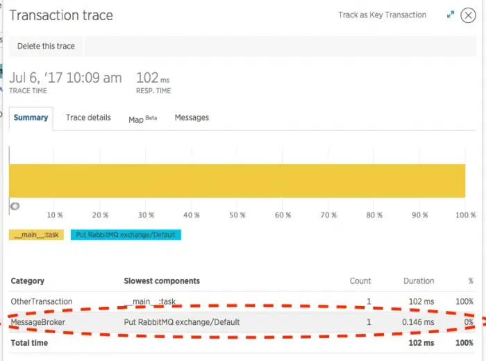 The Transaction trace summary page may show Put and Take operations for RabbitMQ in the Slowest components section. For example: