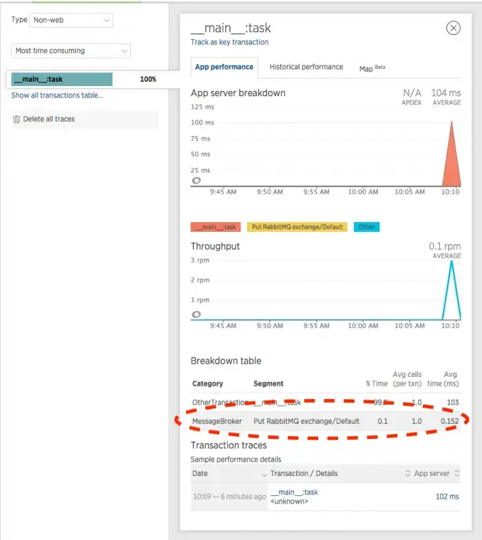 one.newrelic.com > All capabilities > APM & services > (select an app) > Monitor > Transactions > (select a transaction): The transaction’s Breakdown table categorizes queue operations as MessageBroker metrics for RabbitMQ and labels them as Put (publish a message) or Take (receive a message).