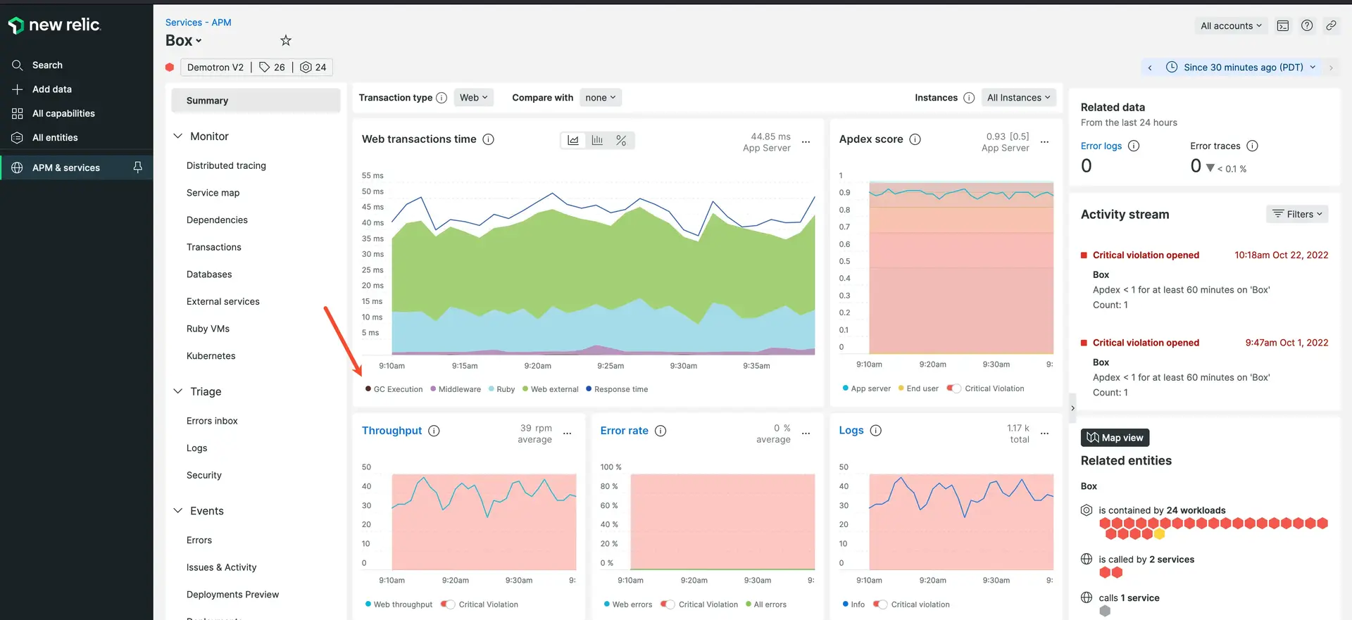 - Log into New Relic, select a Ruby app, and go to Summary.