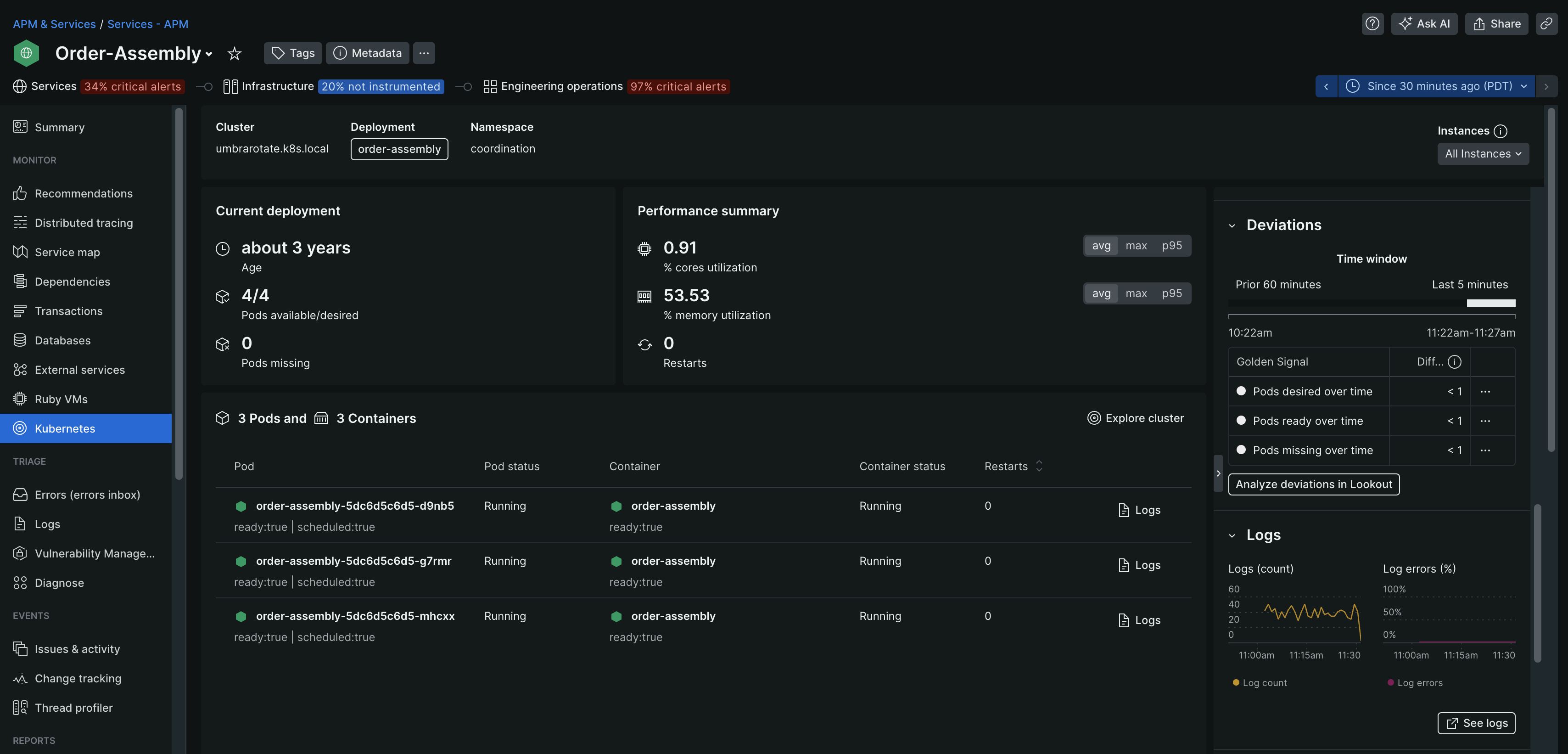 You can surface Kubernetes metadata and link it to your APM agents, whether you use our proprietary agents or OpenTelemetry. uses the Kubernetes metadata to display the specific Kubernetes deployment information related to that APM application.