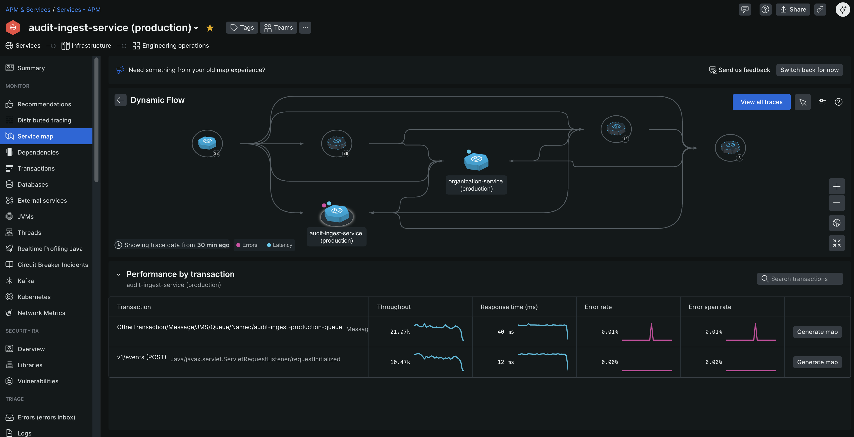 - Dynamic flow map: Visual representation of transaction paths and service dependencies