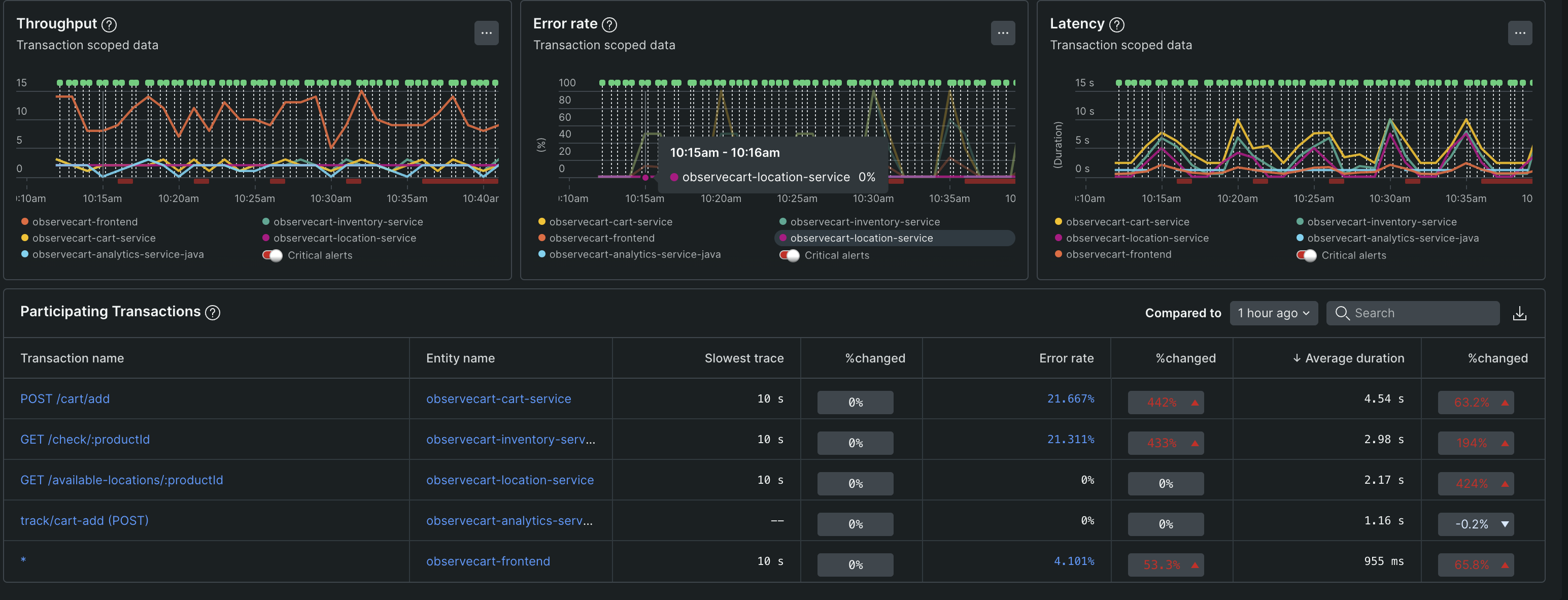 Transaction 360 automatically captures and correlates all entities and data related to a specific transaction, providing a comprehensive view of your distributed workload. This holistic approach includes transaction flows, service relationships, and performance metrics across your entire stack, enabling you to quickly identify and resolve issues.