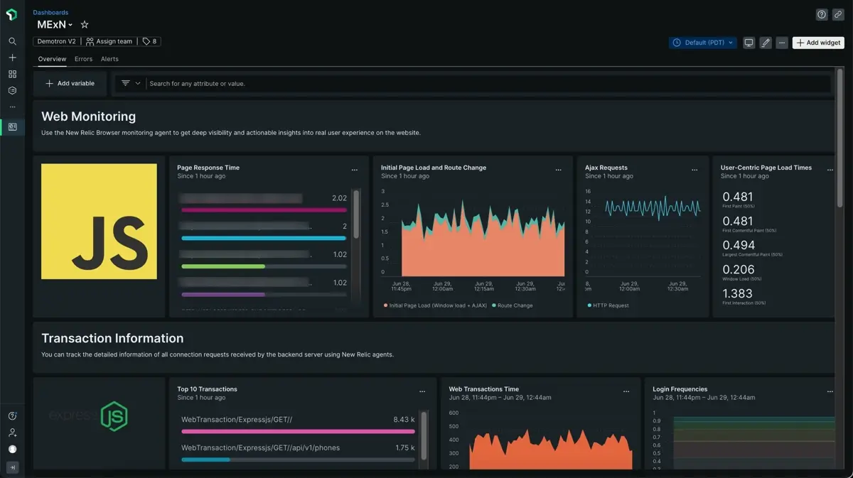 MEAN, MERN, and MEVN stacks are open-source full stack software development kits. Each kit uses a single codebase to develop web applications. New Relic has consolidated all three stacks into a single quickstart. Our MExN integration makes use of the agent, Node.js agent, and MongoDB integration to provide you with a pre-built dashboard with your most important metrics (like response time, CPU utilization, traffic, and login frequencies).