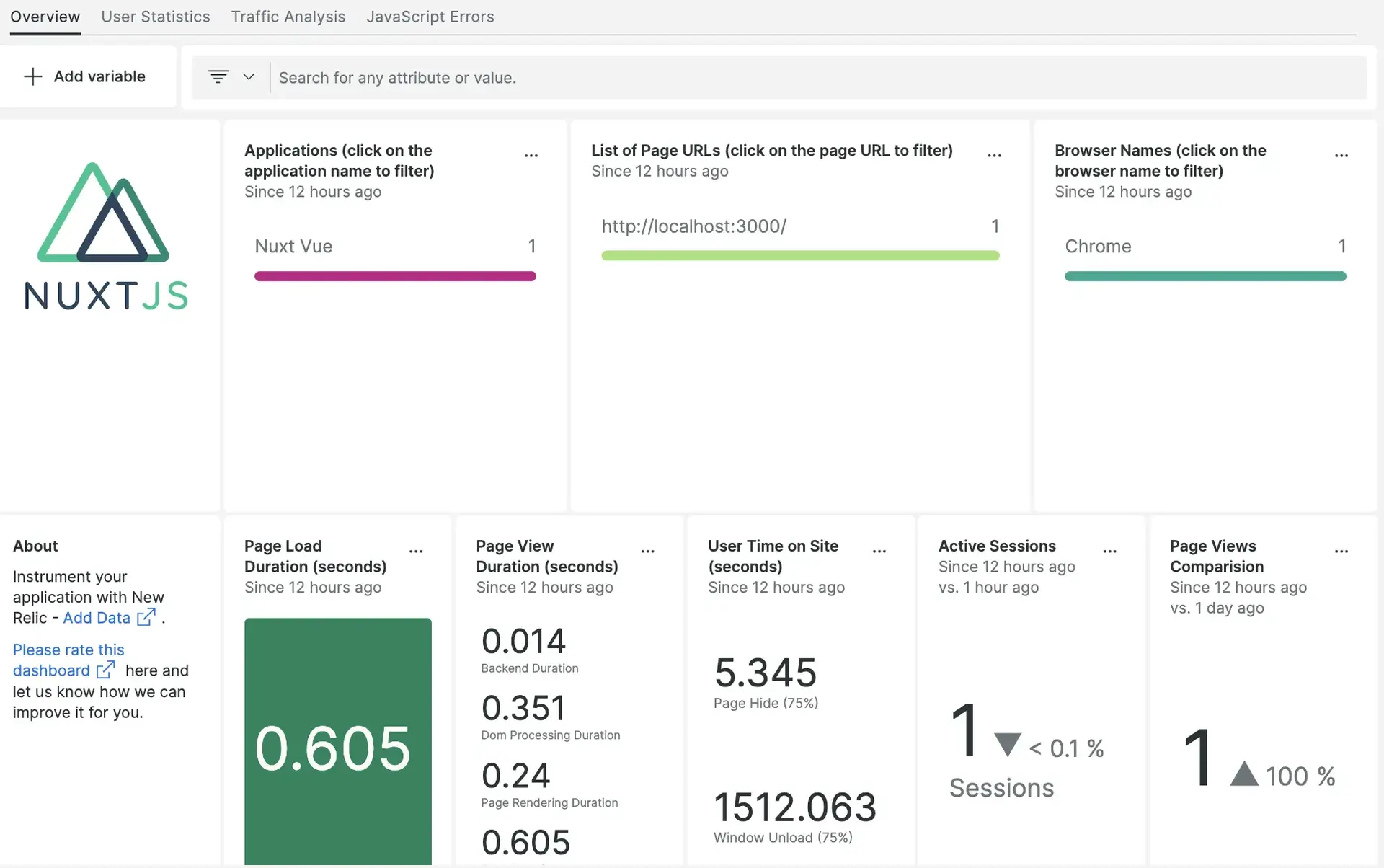 With our Nuxt dashboard, you can easily track your application error rate, initial page load average, route changes, throughput, and page views with JavaScript errors. Built with our infrastructure agent and our Vue , the Nuxt dashboard lets you view critical information all in one place.