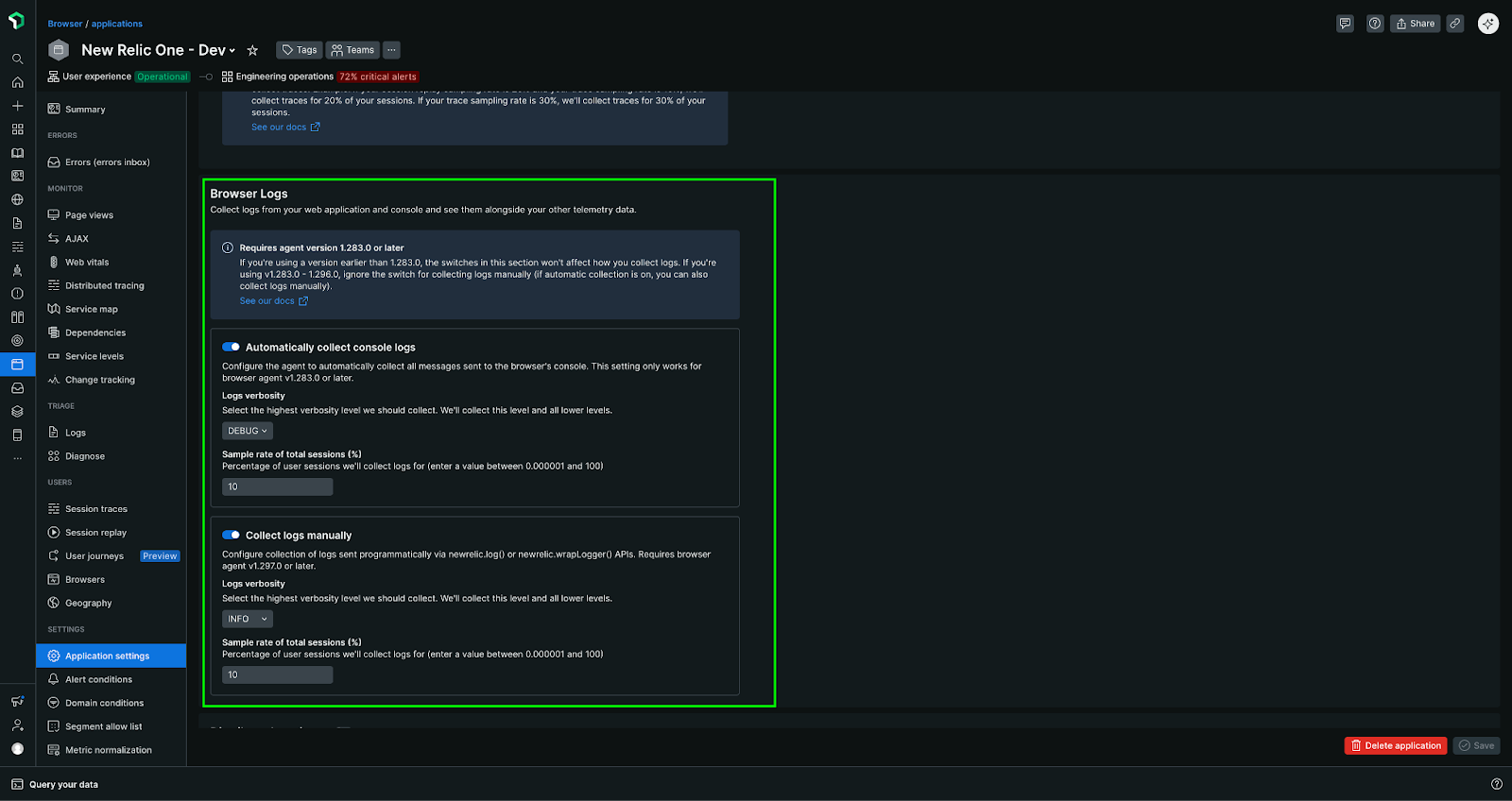 Edit the sampling rate to specify the percentage of user sessions to collect logs. You can enter a value between 0 and 100.