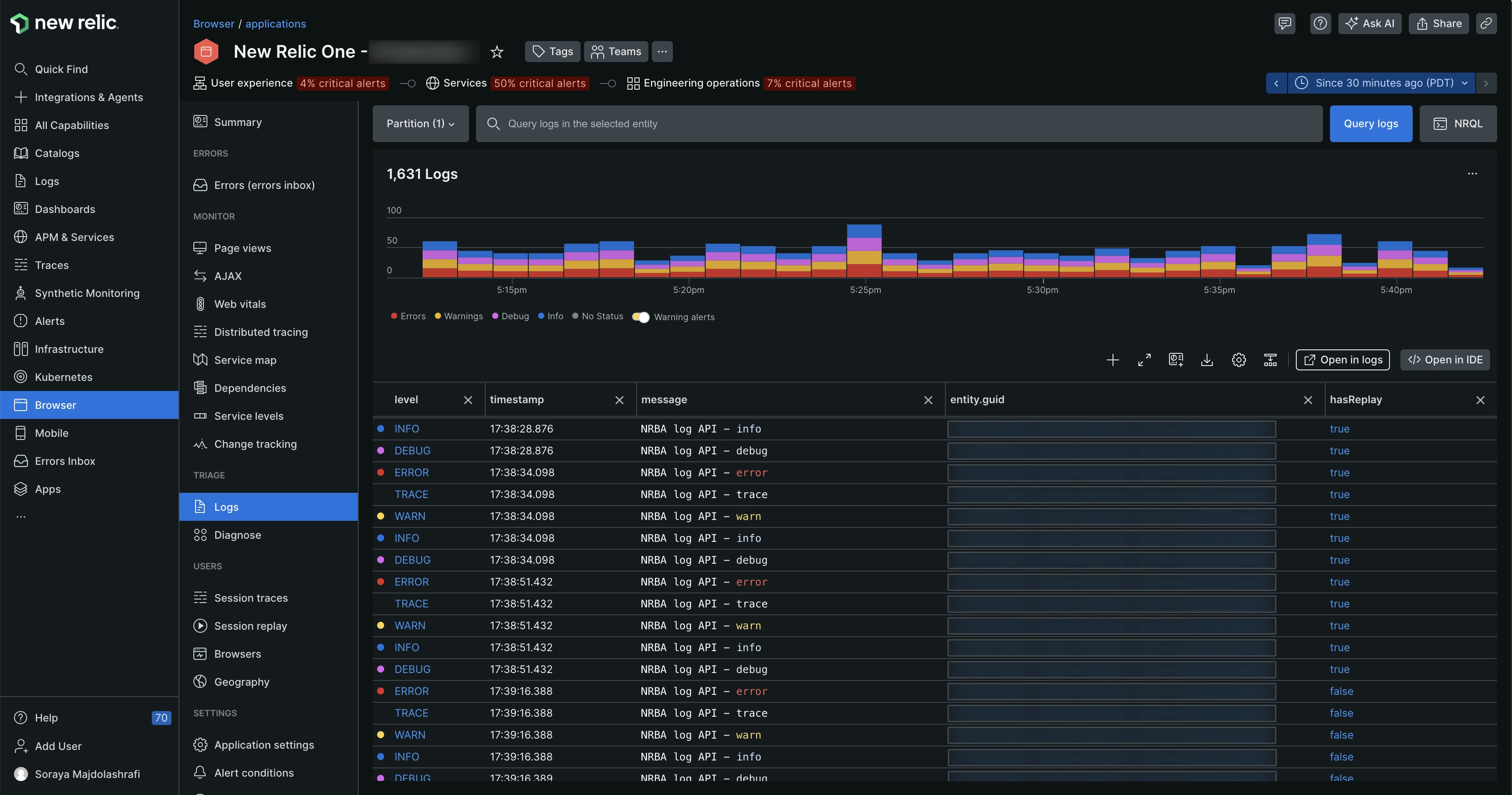 You can also view browser logs in context with Session Replay (if you are using the Session Replay feature) or alongside JavaScript errors in Errors Inbox. Refer Logs in Session Replay and Logs in Error Inbox for more details.