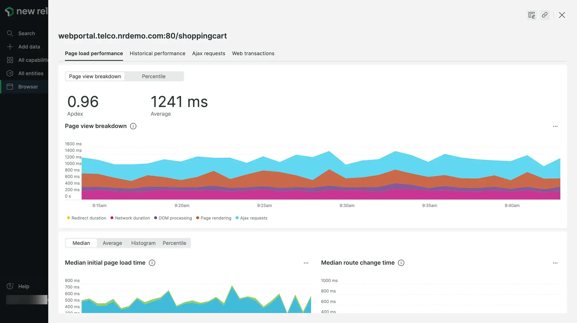 The Historical performance and Breakdown details are similar for both page loads and route changes: