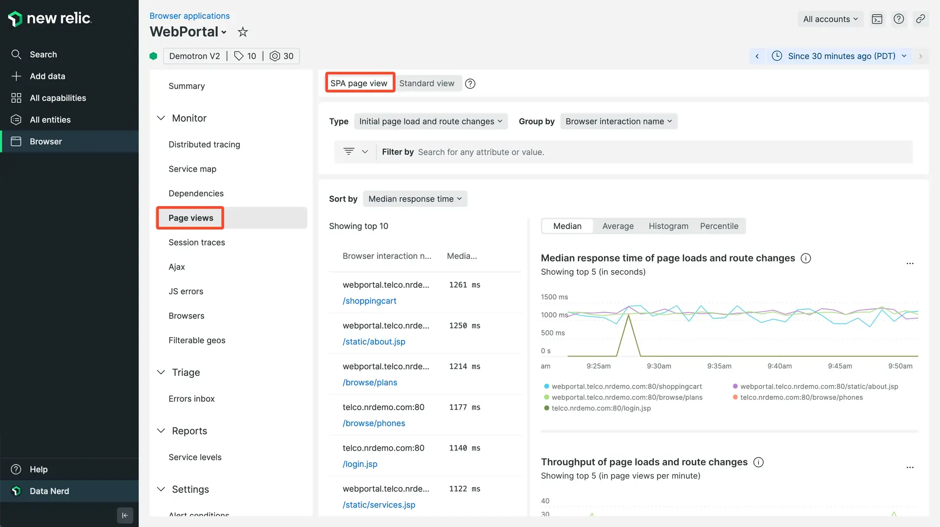 To view SPA data: Go to one.newrelic.com > All capabilities > Browser > (select an app) > Page views.