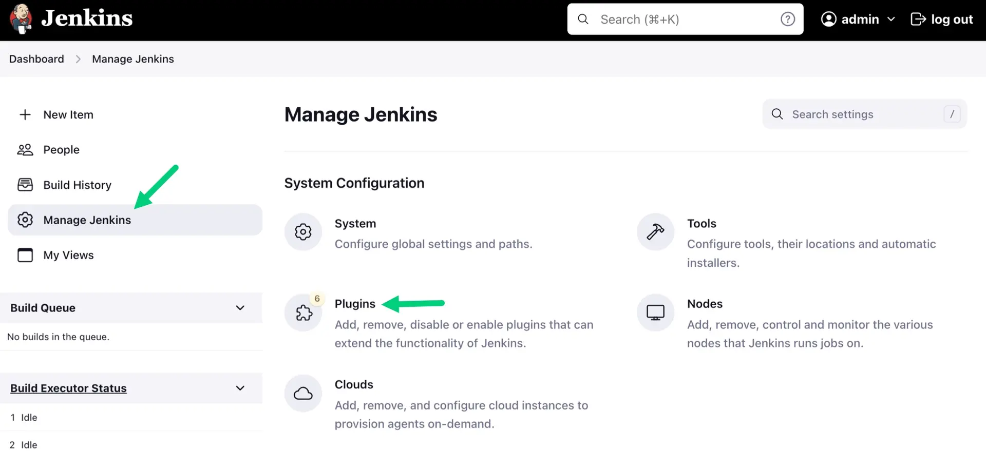 When you open Jenkins, go to Manage Jenkins, then Plugins.