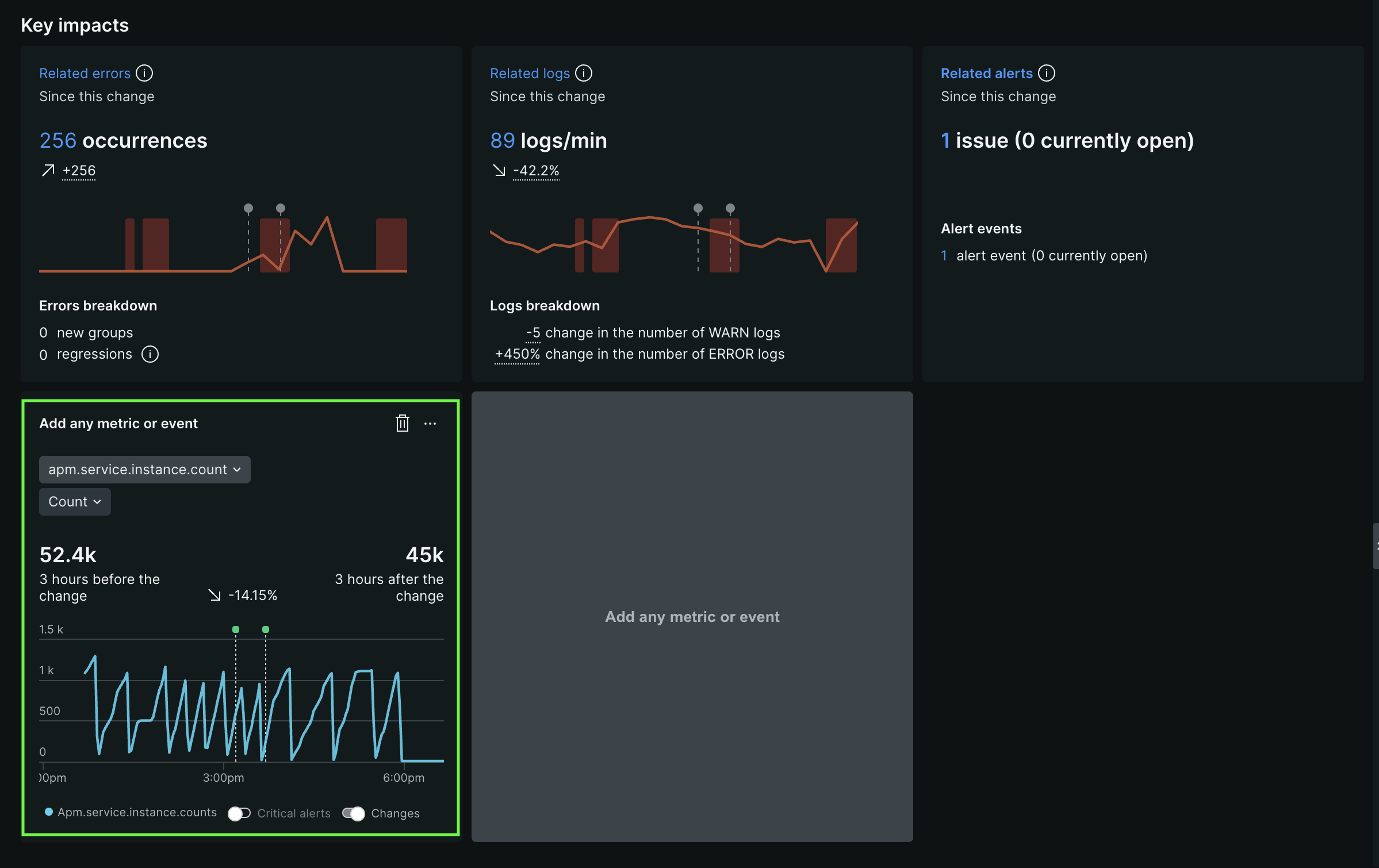 For example, if something is wrong with your system, you can view all of the changes from your system in one place and correlate them with system performance metrics of your choice to quickly identify problematic changes.