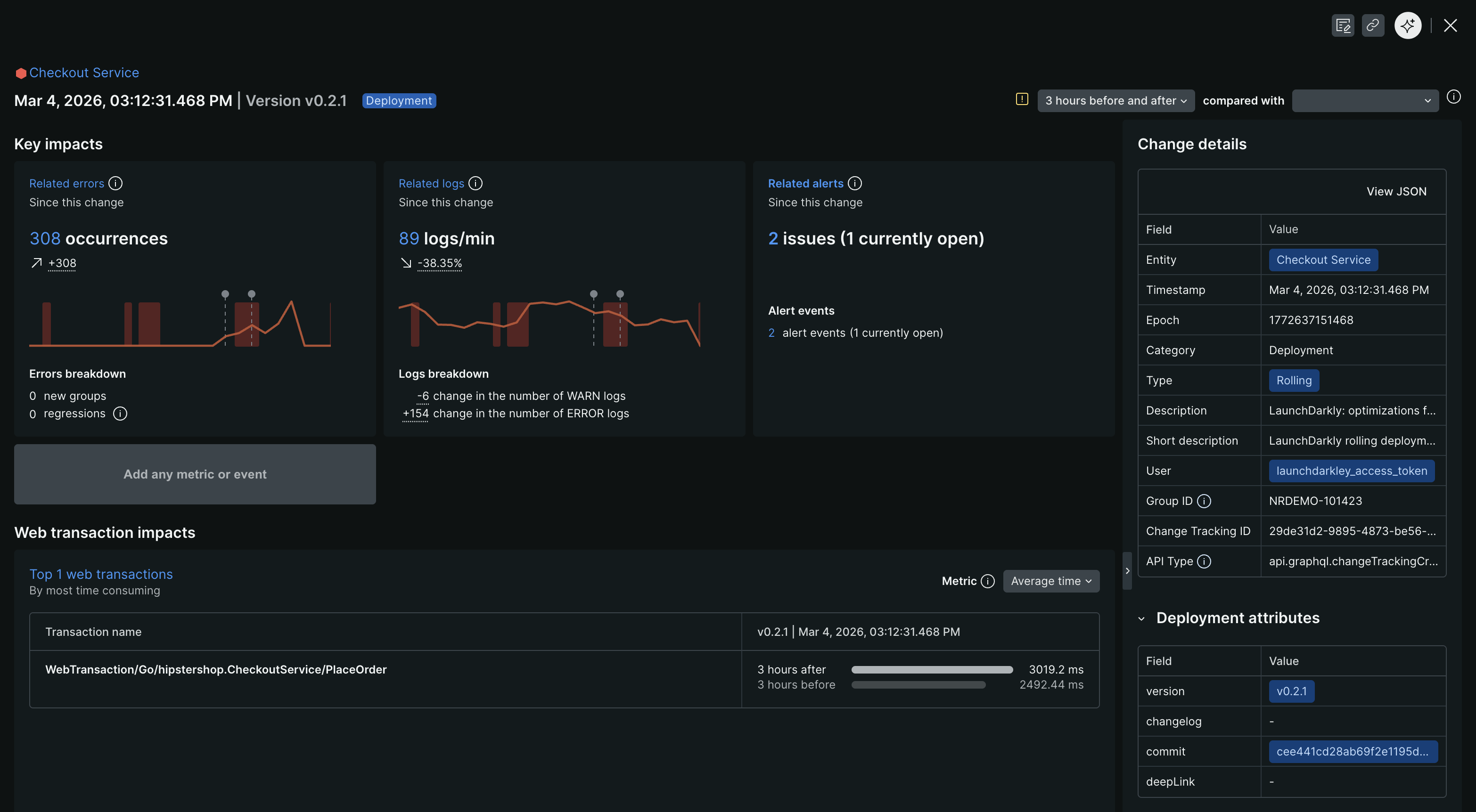 After setting up change tracking, you can analyze how deployments, feature flags, and other modifications impact your system performance. This page shows you how to access change tracking data, view changes across your system, and understand their impact on performance metrics.