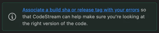 When viewing an error in CodeStream, you may see a build SHA or release tag associated with the error if it doesn't have a git reference. CodeStream uses the git reference to match the specific stack trace error with the version of the code running in the environment that triggered the error. While you don't need a git reference configured to investigate the error, bear in mind that you may not be looking at the version of the code that caused it.
