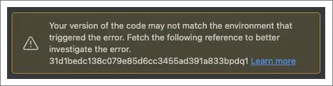 If you do have git references configured, CodeStream will let you know if the version of the code you're on locally doesn't contain the reference associated with the error. In this case, you may want to check out the version of the code that does contain that reference so that you can more effectively investigate and resolve the error.