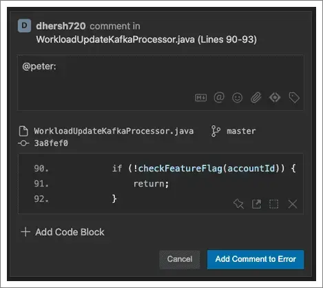As you navigate the stack trace, you can find code that seems like the source of your problem and start a discussion with the comment button. CodeStream automatically mentions the most recent person to touch that code, making it easy for you to bring the right people into the discussion.