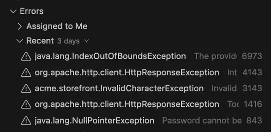 CodeStream shows you errors for any APM or browser monitoring service, including errors assigned to you and recent errors happening in the code opened in your IDE. You can control the timeframe via the dropdown list in the heading of this section. Note that this list may be a subset of the errors shown in the errors inbox on New Relic.