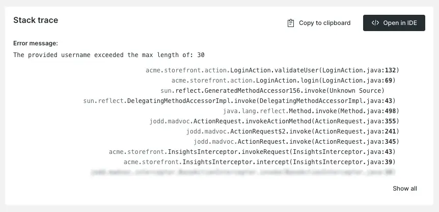 Click any frame in the stack trace to jump straight to the corresponding file and line number. If you're associating git references with your errors, CodeStream opens a read-only editor tab of the file that triggered the error in the environment. If you aren't associating git references, then a local version of the file opens instead. You won't be able to click stack trace frames that represent code not part of your repository (e.g., an external library).
