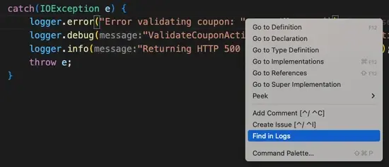 You can also jump into a log search right from any log line in your code. You can select a string to search for and the select Find in logs from the context menu. You can also just select Find in logs without first selecting any text, and CodeStream will automatically extract the string from the line where the cursor is placed.
