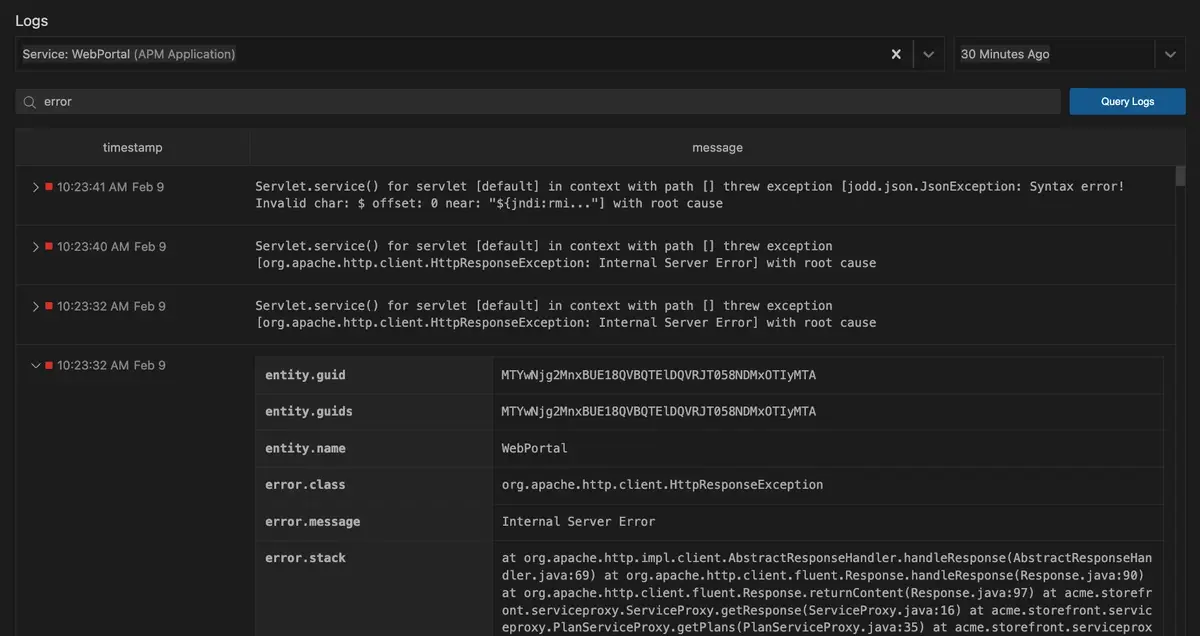 The dropdown list at the top of the page reflects the currently selected service in the CodeStream pane's tree view. However, you're free to choose any service or entity to view its logs.