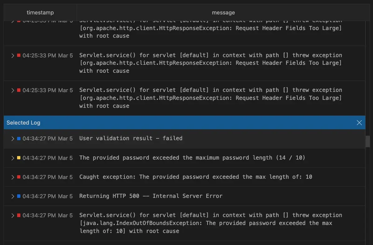 Expand log entries for detailed information by clicking the caret next to them. Hover over any value to copy it.