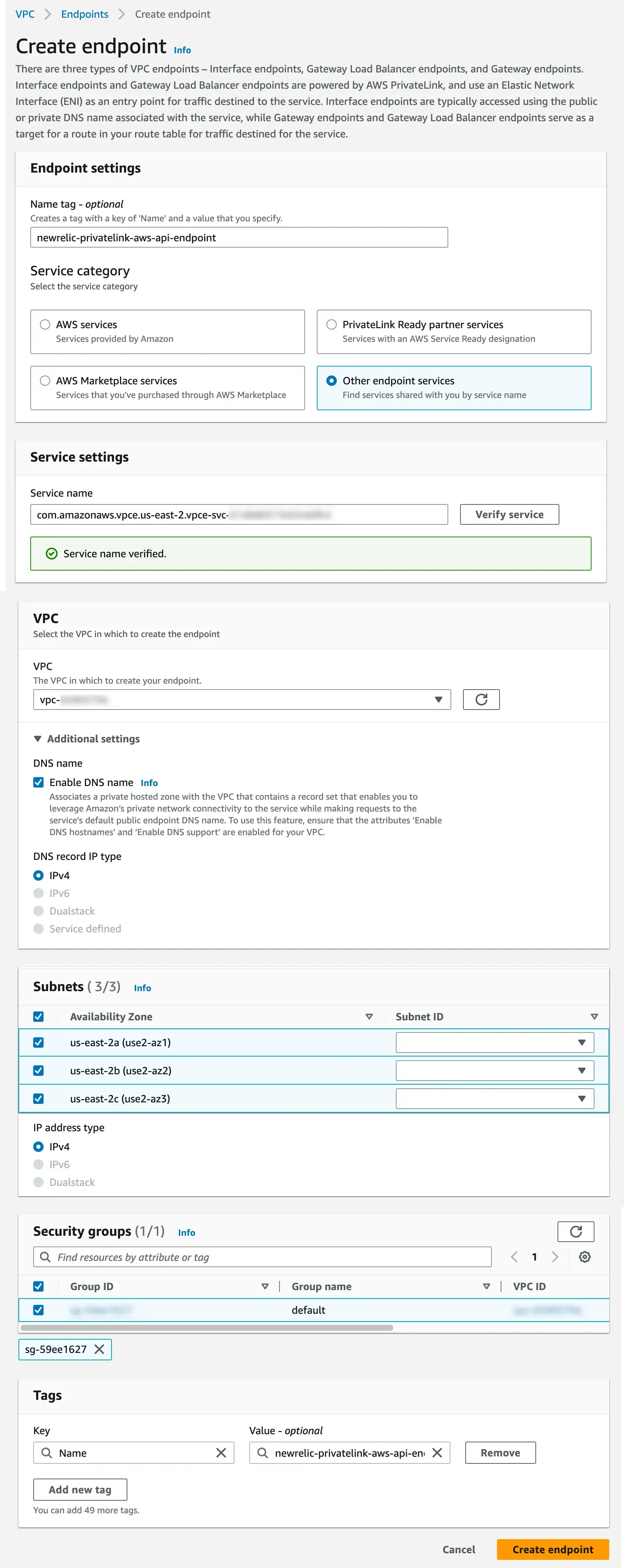 For each of the New Relic endpoint services you're using from the table above, create and attach a VPC endpoint within your VPC. When creating these endpoints, you'll need to configure the VPC subnets and security groups corresponding to the availability zones that New Relic has configured with the endpoint service.