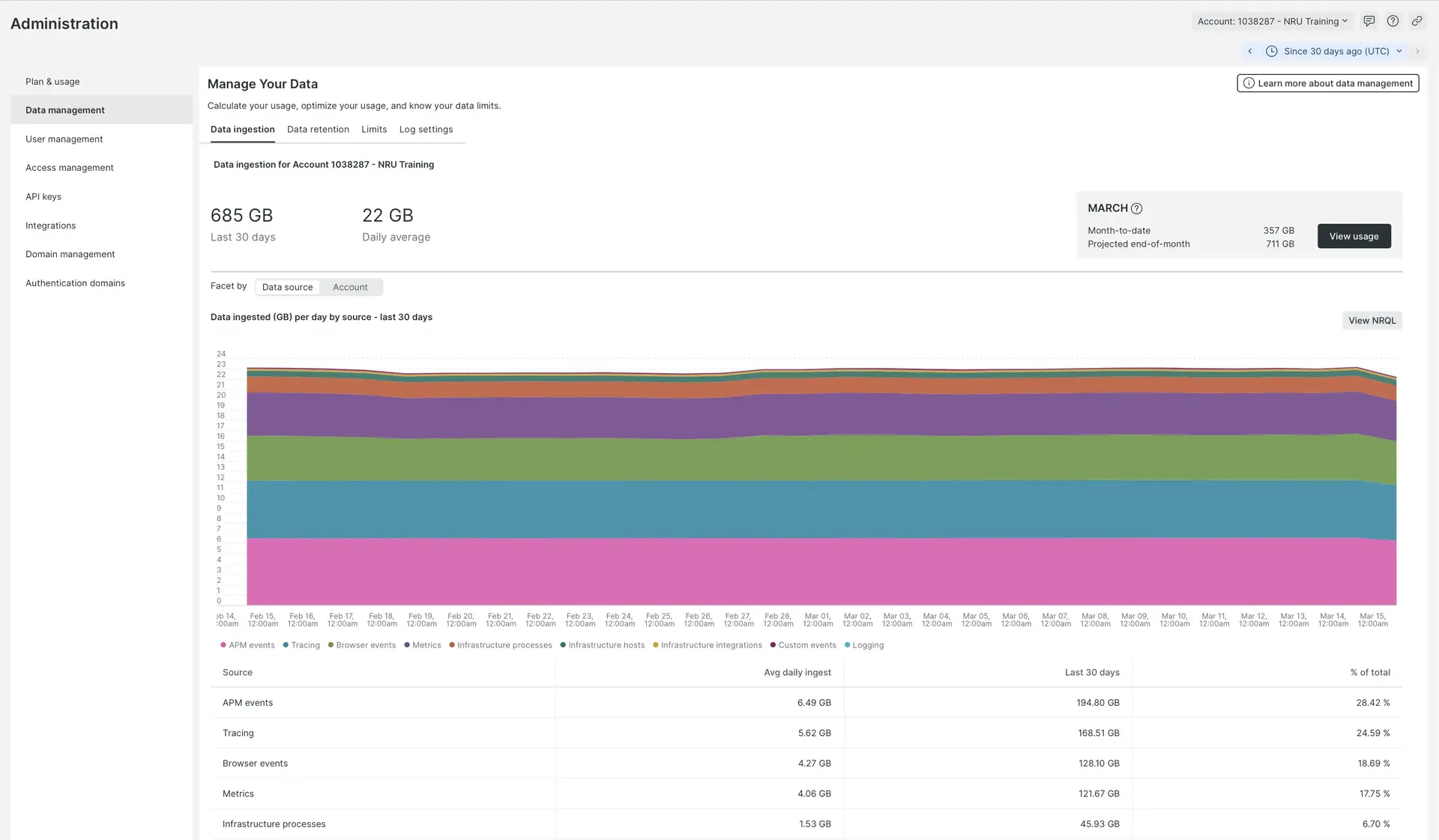 The Data ingestion tab is located in the Data management UI. The data ingestion UI shows a summary of your usage by data source. For organizations with multiple accounts, you can also view the usage of specific accounts.