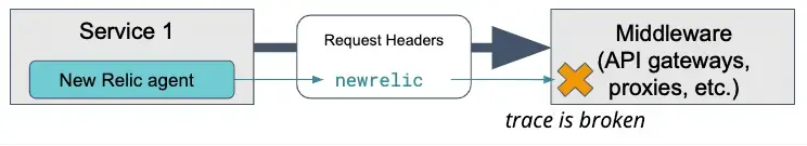 If your transactions are only sending the proprietary New Relic header, some middleware might not recognize the format and then drop the information as shown in this diagram: