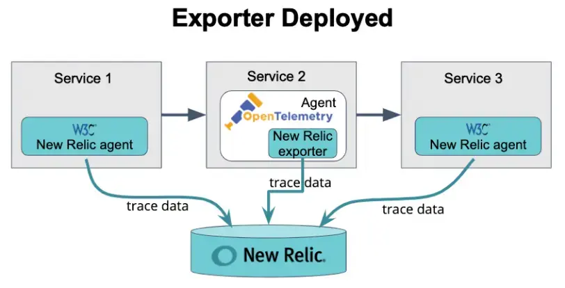 The following diagram also shows successful header propagation, but it includes an exporter in Service 2 that sends the span details to New Relic (see Trace API):