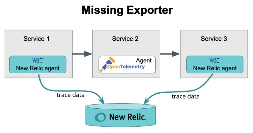 Sometimes header propagation is successful, but the span information isn't getting sent to New Relic. For example, if OpenTelemetry is not instrumented with a New Relic exporter, the span details never make it to New Relic.