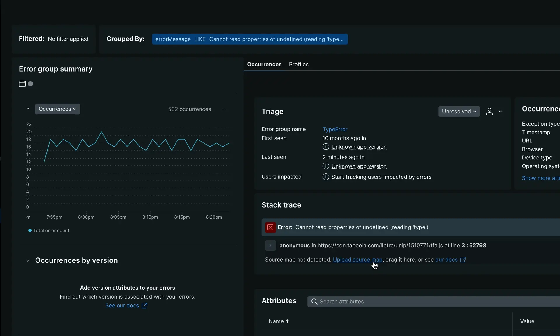 With Group errors tab you can dynamically filter and group errors for deeper analysis. Group errors shows you where your JavaScript errors are happening, and provides tools to help you figure out the root cause. You can also track the scope of errors through Sessions impacted, which automatically shows how many browser sessions are affected by each error group. Additionally, you can query and create dashboards of JS error data in the query builder, or use the browser API to monitor handled errors.