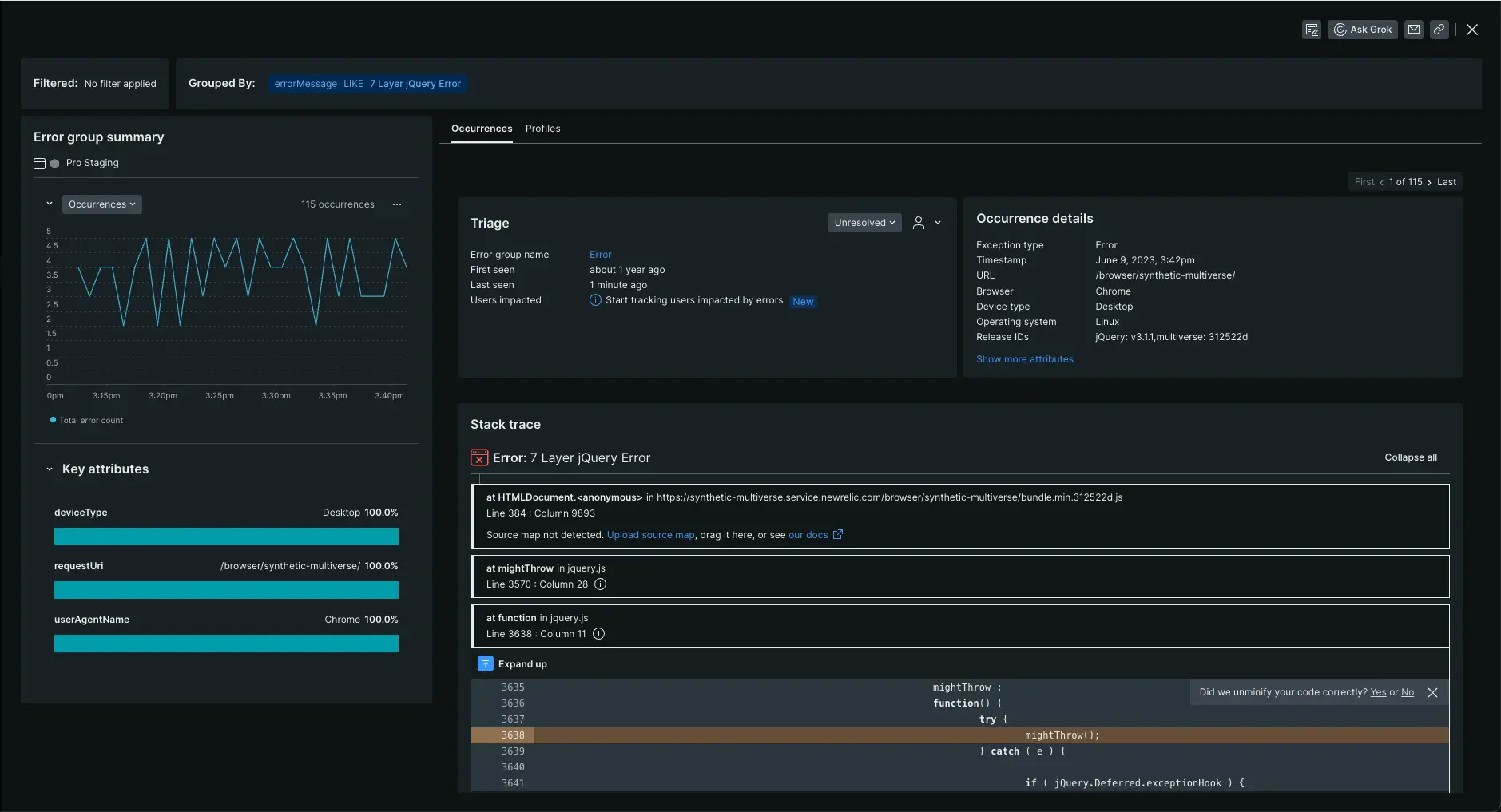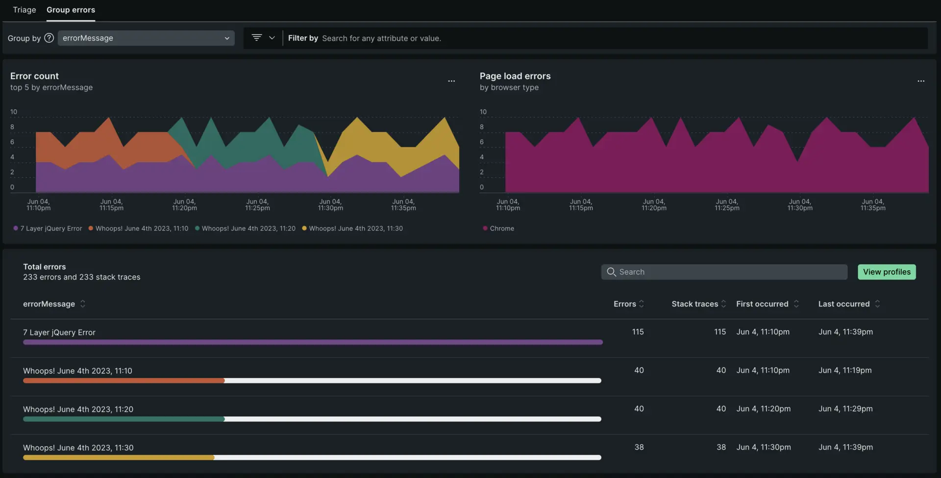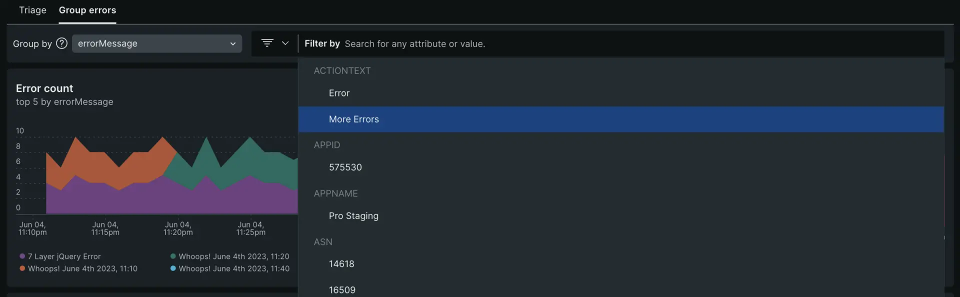 - Dynamic grouping: The default grouping for error occurrences is based on the error message. You have the option to change the grouping options by any attribute, up to five attributes at a time.