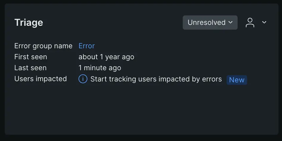 The triage section links the specific error occurrence you're viewing to a system-created error group that has a unique fingerprint. Why does that matter? That unique fingerprint enables you to triage an error group using a status update or assignment. The system-created error groups are the ones you find on the Triage tab. For more info on how they are generated, see How error groups work.