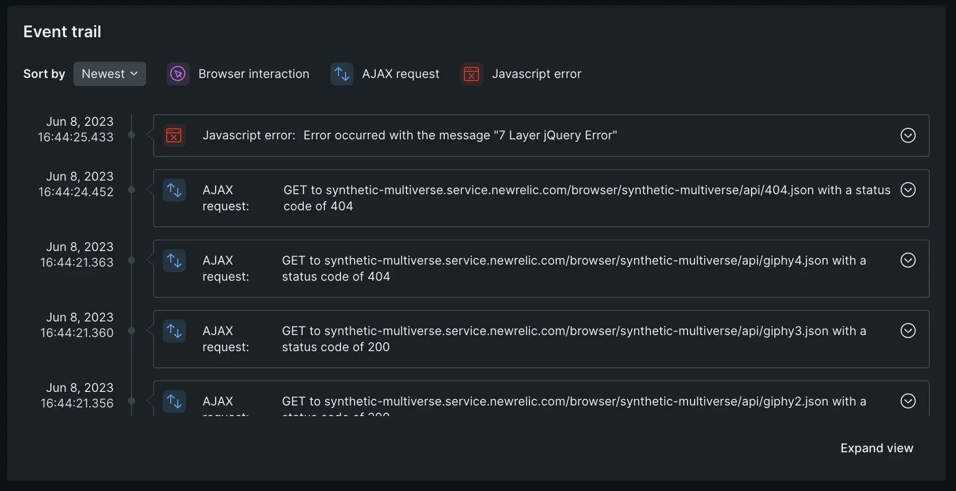 For some older browsers, the following errors may be unavailable:SPA monitoring must be enabled. The event trail shows the browser interactions, AJAX calls, and traces that led up to a Javascript error. This can help you troubleshoot the root cause of errors.