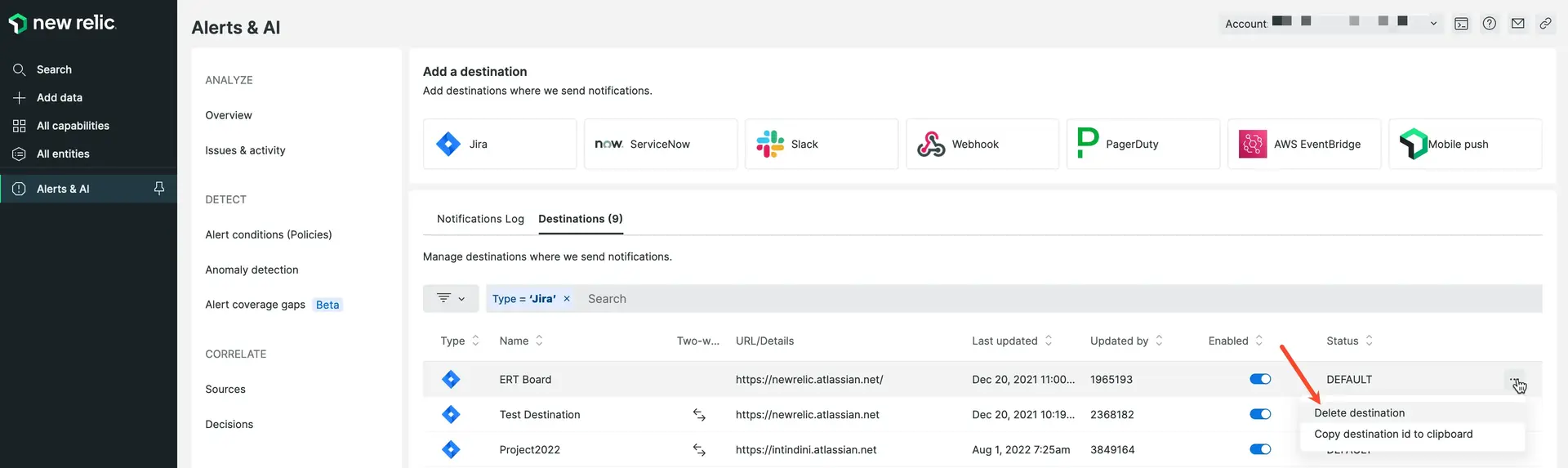 Go to one.newrelic.com > All capabilities > Alerts > Destinations.